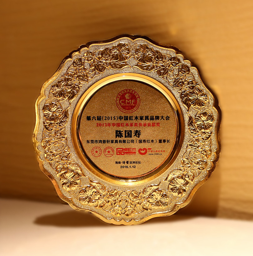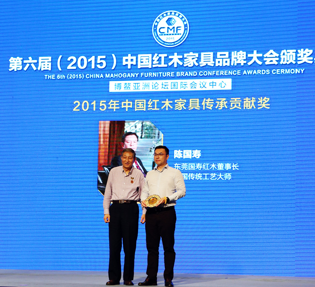 国寿红木董事长陈国寿凭着一颗匠心,积极传承传统红木家具手工技艺、文化内涵并注入艺术灵魂,及对整个红木产业发展起到带头引领作用,夺得“2015年中国红木家具传承贡献奖”。