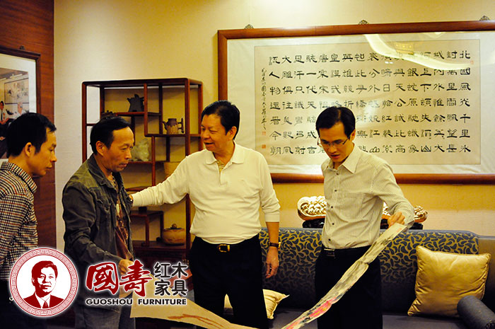 东莞市鸿普轩(国寿红木)家具有限公司董事长陈国寿先生(右二)和广东省书法家协会副主席周汉标先生(左二)等人鉴赏书法国画艺术