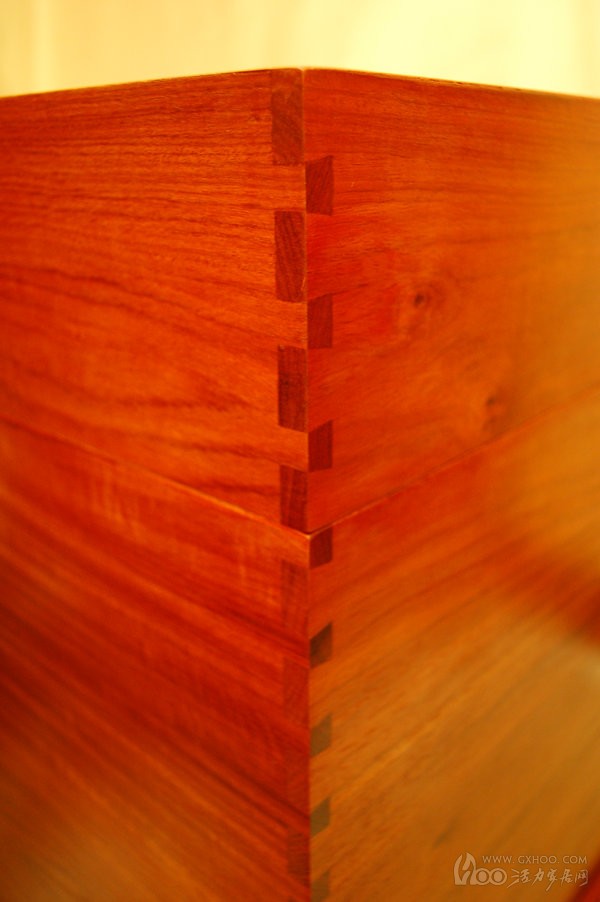 该专卖店的导购员介绍说,榫卯结构是实木家具中相连接的两构件上采用的一种凹凸处理接合方式,这种形式在我国传统家具中达到很高的技艺水平。榫卯结构组合的家具比用铁钉连接的家具更加结实耐用。红木木质坚硬,而铁钉是靠挤和钻劲硬楔进去的,此过程极易造成木材劈裂,而使用榫卯连接红木家具,可以大大提升红木家具的内在品质。
