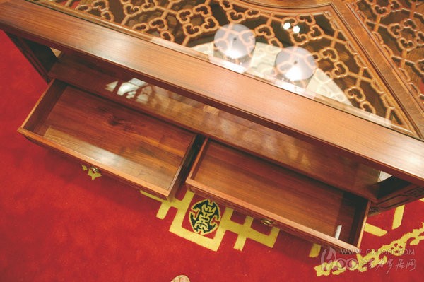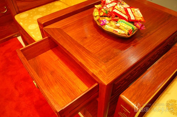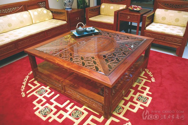 茶几在客厅中所扮演的角色不仅仅是摆放茶杯那么简单,越来越多的人追求茶几收纳功能的最大化。从外表上看这款大茶几与其他的茶几没有太大的差别,但实质上又有所区别。一般的茶几台面都是木板的,而这款福满堂大茶几台面铺有一面透明的玻璃,下面是四处云纹的图案,既古典又现代的中式风格,灯光照射下,台面下会呈现出美丽的影子,除了外型上比较美观之外,另外玻璃台面比较容易清洗。与沙发框架相同,大茶几也是采用大果紫檀的实木材质。
