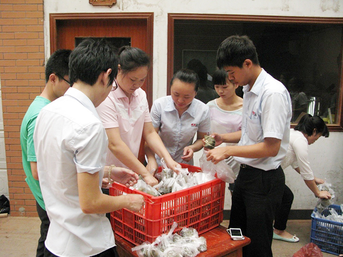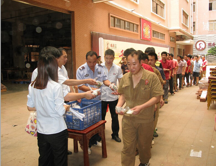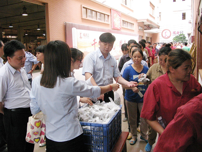 “五月五,是端阳。门插艾草,香满堂,吃粽子,喝雄黄,划起龙舟庆吉祥“。2014年5月30日上午,为了践行公司的感恩文化,为全体员工送去节日的问候,鸿普轩特组织公司管理层为全体员工派发了爱心粽,让全体员工感受到家的温暖。陈董事长、陈总为大家送来了节日的问候,何副总、王副总、唐部长、周主管、黄主管等为员工派发粽子。