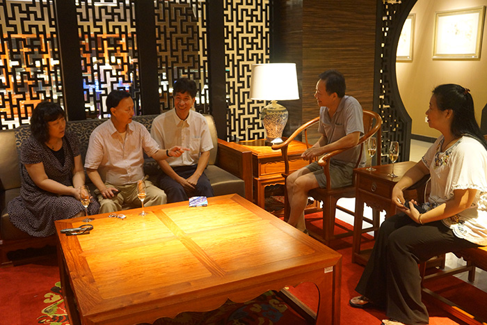 李鸿基先生为国寿红木董事长陈国寿先生、副董事长陈淦凡先生、古典红木家具网林伟华先生介绍展品
