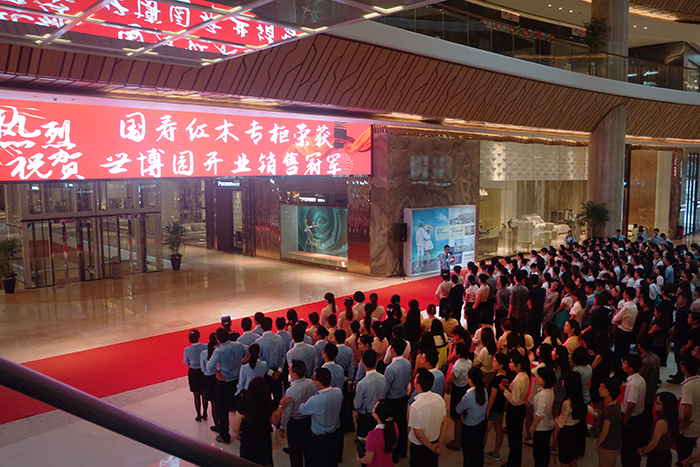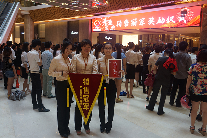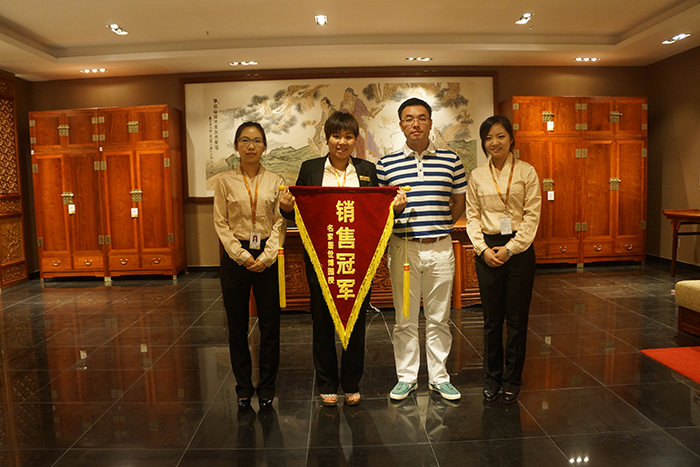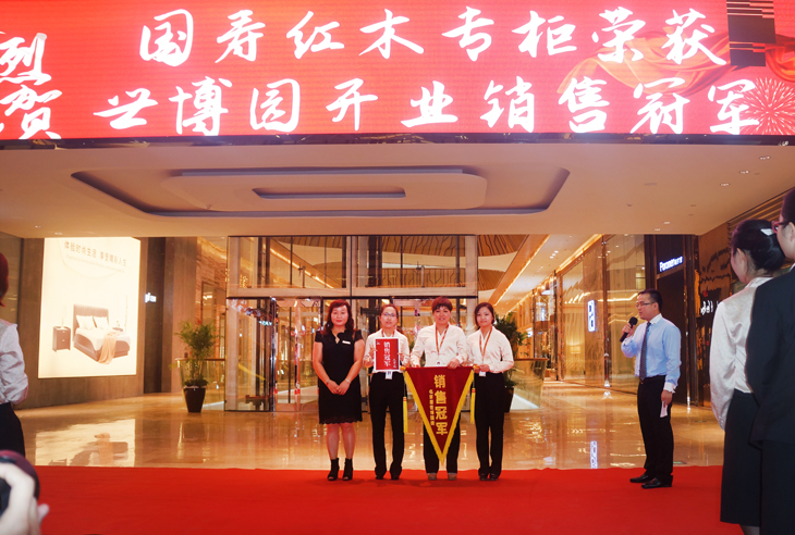 2014年7月11日上午,广东现代国际展览中心9号馆世博园馆隆重举行“世博园开业销售冠军颁奖仪式”,国寿红木家具独占鳌头、获此殊荣,世博园领导向国寿红木家具代表授予“销售冠军”锦旗并颁发了丰厚的现金大奖,这一刻,全场响起雷鸣般的掌声,不约而同地为国寿红木家具欢呼、喝彩。