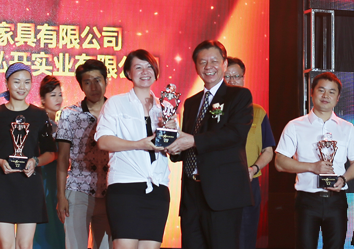 国寿红木董事长陈国寿先生和国寿红木设计总监陈映雄女士上台领奖