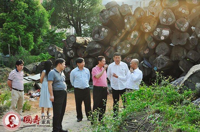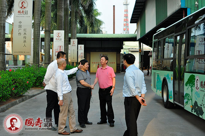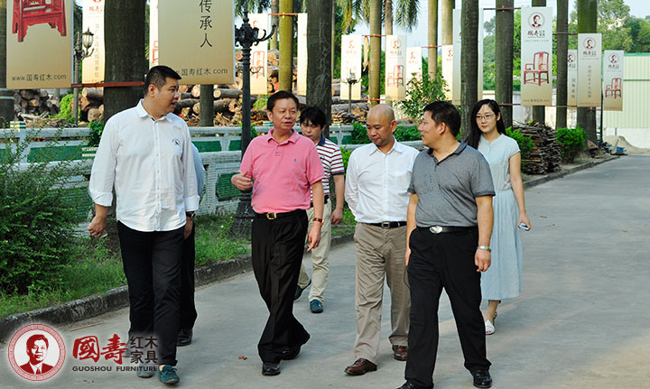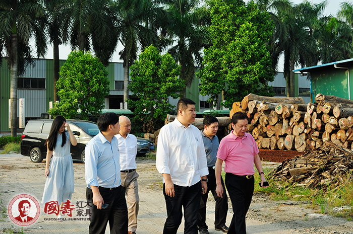 国寿红木董事长陈国寿先生(右五)、国寿红木副总经理王耀佳先生带领香港金马凯旋集团董事长肖凯旋先生(右三)、深圳市名汉唐设计有限公司董事长卢涛先生(左一)、郑州凯丽家居商贸有限公司总经理付向前先生(右二)参观国寿红木家具生产基地